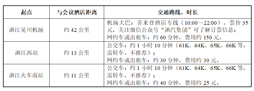 會務(wù)組將于2023年11月6日在湛江吳川機(jī)場、湛江西站、湛江火車南站安排志愿者迎接參會嘉賓。交通運(yùn)輸信息請咨詢湯保貴老師(13434606829)。
